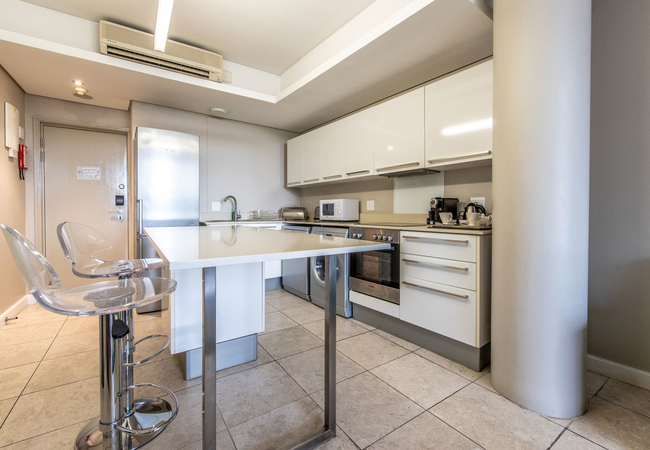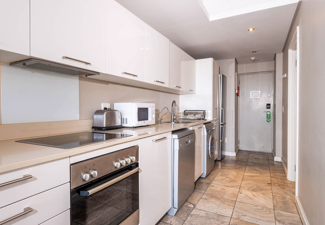 The Studio Suite has a lounge, private balcony, an open plan bedroom, a complete bathroom with a separate bath and shower, toilet and basin, as well as a fully equipped kitchen including a microwave, toaster, fridge/freezer, stove/oven, dishwasher and washing/dryer machine. This bedroom has a King-size bed and there is a sleeper couch in the lounge. Rooms are equipped with air-conditioning, a mini bar fridge (stocked on request), tea and coffee facilities, digital safe, hairdryer, iron and ironing board, a writing desk, Wi-Fi access and satellite TV channels.