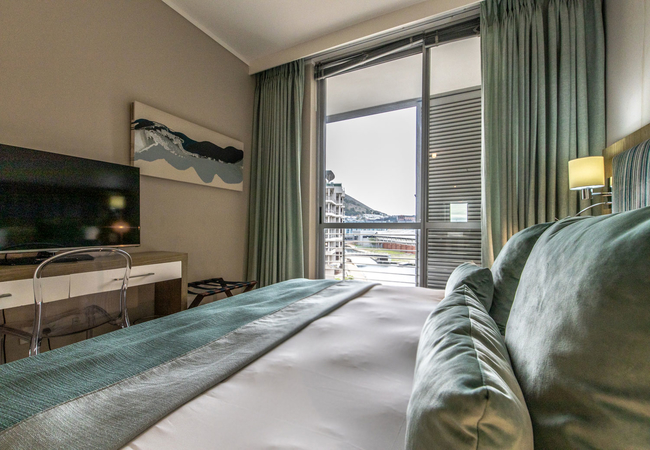 Luxury Hotel Rooms are furnished with a King-size bed or twin beds and a bathroom with a separate bath and shower, toilet and basin. The room has a balcony with views over the Canal and towards the CBD and Table Mountain. Rooms are equipped with air-conditioning, a mini bar fridge (stocked on request), tea and coffee facilities, digital safe, hairdryer, iron and ironing board, a writing desk, Wi-Fi access and satellite TV channels.