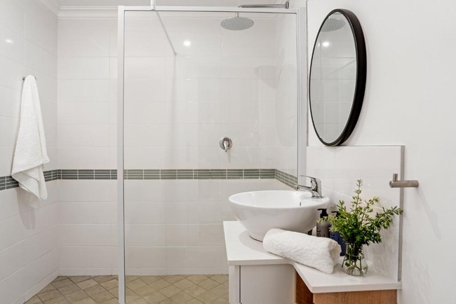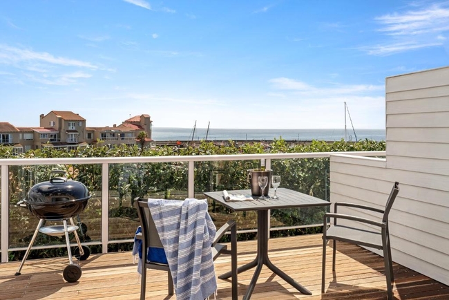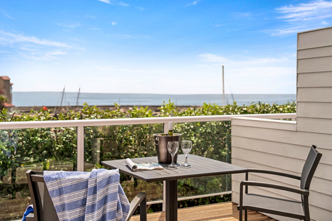 The open-plan layout includes a dining area and a stylish lounge with a TV featuring Netflix and other streaming platforms (guests are required to use their own login credentials). Every apartment opens onto a private balcony furnished with comfortable outdoor seating, offering a space to unwind in the fresh coastal air.