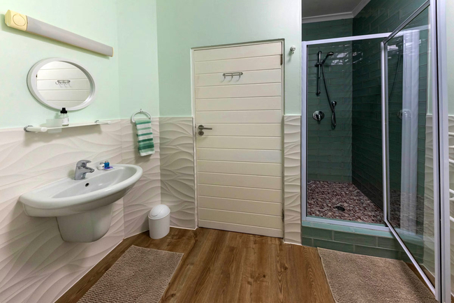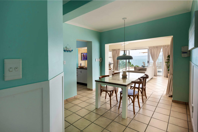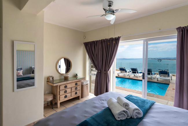The master bedroom is furnished with a Queen size bed and has an en-suite bathroom with a shower and ample wardrobe space for long term stays. The guest bedroom offers two single beds and ample wardrobe space. Both bedrooms have sea and pool views with sliding doors onto the veranda for breezy fresh ocean air. A full guest bathroom with a shower and bath can facilitate the second bedroom.