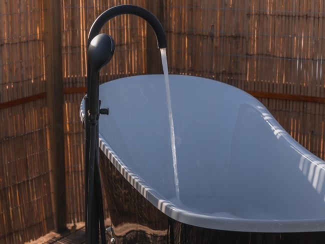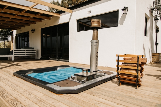 Out on the patio is where you can really enjoy the view while soaking in your own private wood fired hot tub. There is a table and chairs.