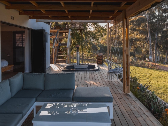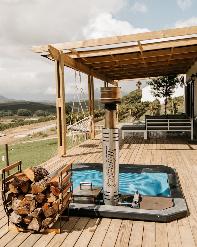 Heaven's View Luxury Villa is a two bedroomed holiday home in Stellenbosch. Each room is furnished with a King-size bed and an en-suite bathroom fitted with a shower, toilet and basin. The villa has a well equipped kitchen that boasts a dishwasher, washing machine and tumble dryer for convenience. There is a dining table and the sitting room has comfy seating and has spectacular views. Out on the patio is where you can really enjoy the view while soaking in your own private wood fired hot tub. There is a table and chairs.