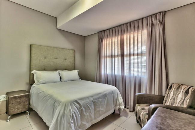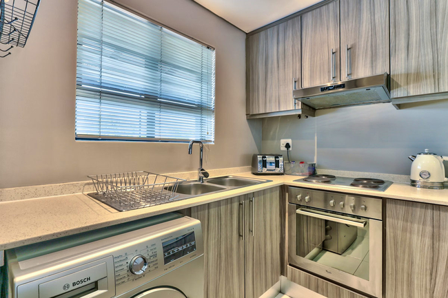 The unit features a well equipped kitchen with a stove, oven, microwave, toaster, kettle, fridge freezer, and a breakfast bar with stools. The lounge and dining area provides comfortable seating for dining and relaxation. Entertainment is available via a flat screen television with selected DStv channels, and free Wi Fi access is provided for guests.