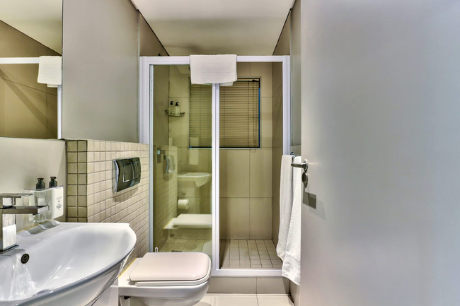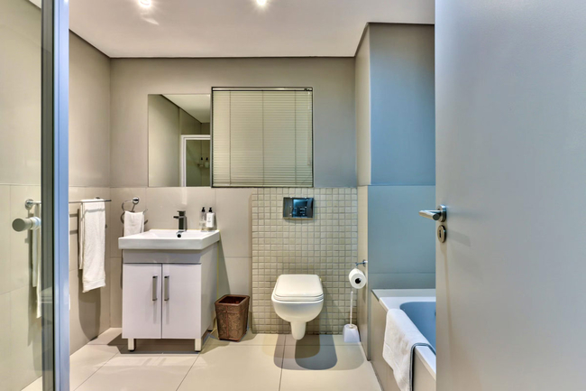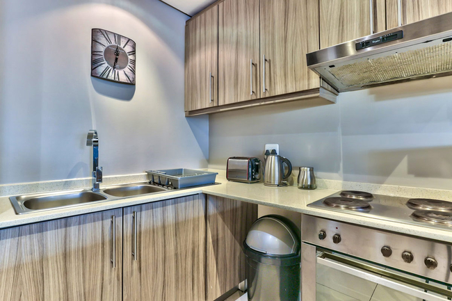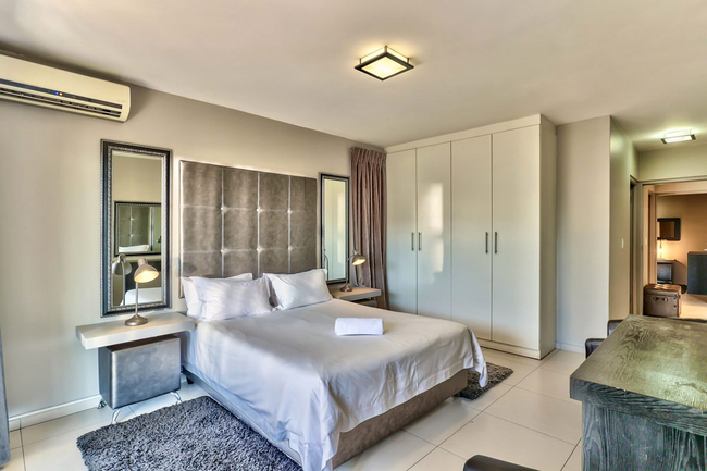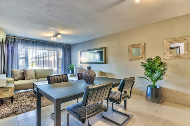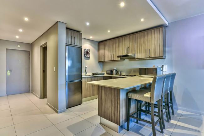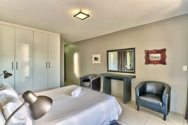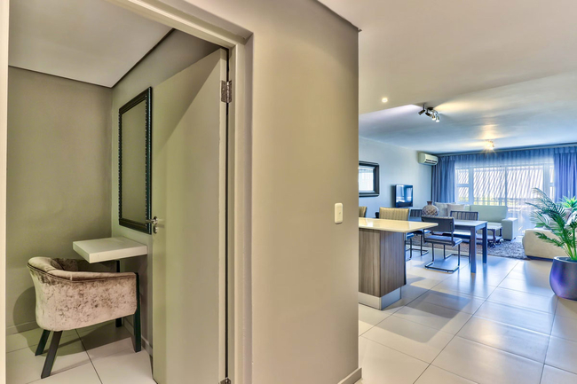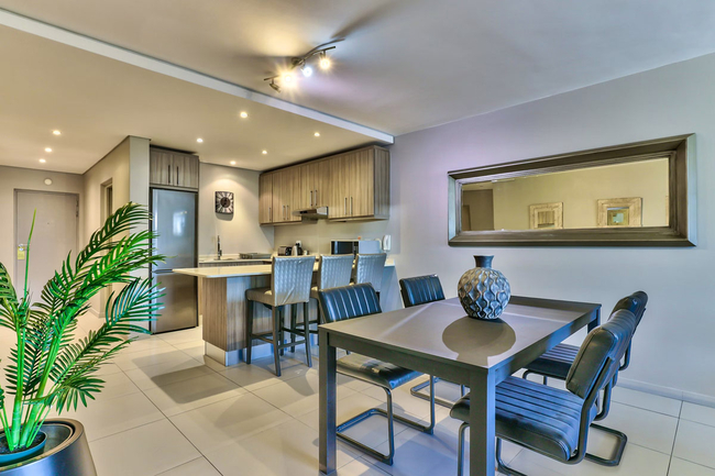 The adjoining lounge and dining area provide comfortable seating for both relaxation and shared meals. For entertainment, guests have access to a flat-screen television with selected DStv channels as well as complimentary Wi-Fi. The complex offers 24-hour on-site security along with basement parking, ensuring a secure and convenient stay.