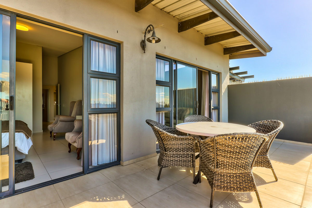 The unit opens onto a spacious patio with outdoor seating, ideal for enjoying fresh air and relaxation.
