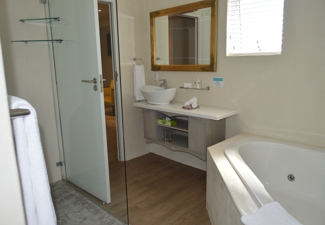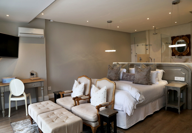 This spacious room is situated in the main guesthouse and is furnished with a double bed. The en-suite bathroom is equipped with a shower and jet-bath. All the rooms are equipped with air conditioning, coffee and tea making facilities, flat screen TV with selected DStv Channels, King size beds and spa baths.