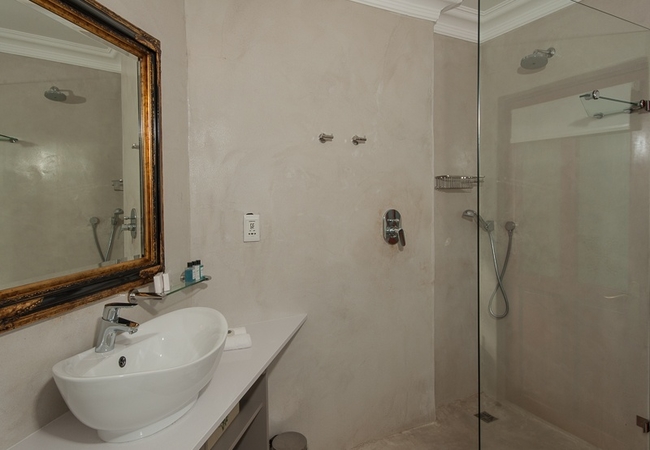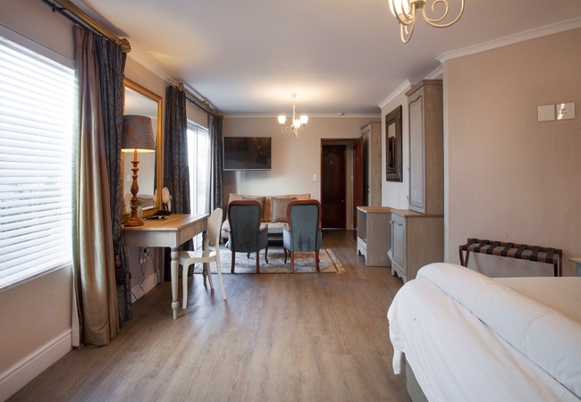 Situated in the main guesthouse, this spacious room has an en-suite shower and jet-bath, air-conditioning, flat screen LED TV with DStv, Wi-Fi, mini-bar, tea / coffee making facilities and a sofa bed.