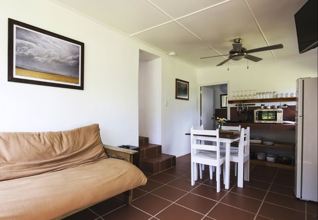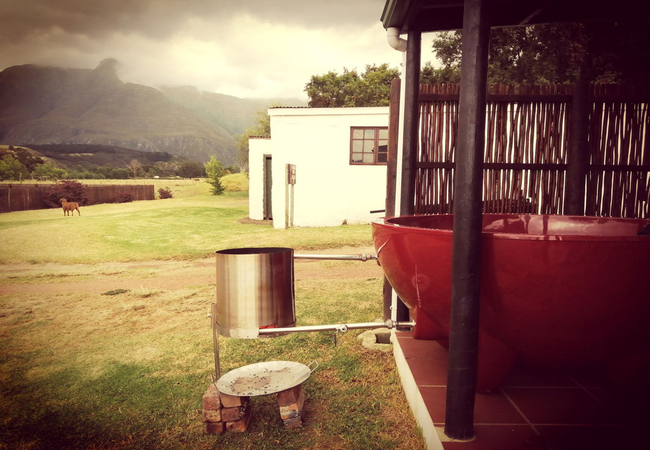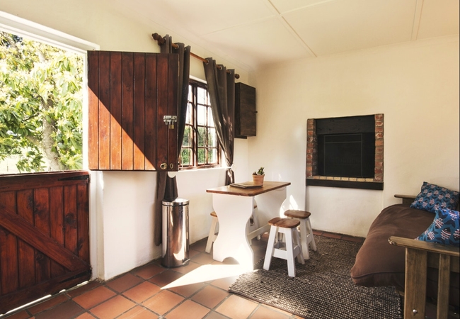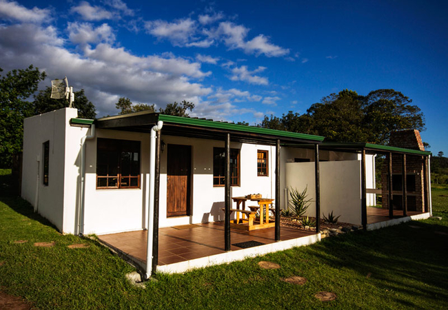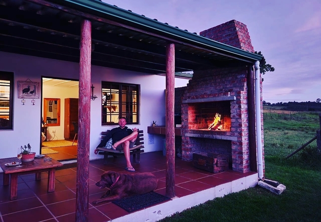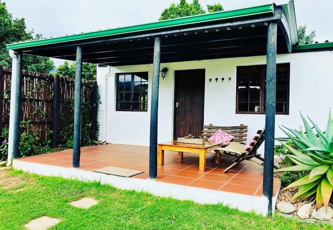 More private and separate from the others.The setting is pastoral bliss: a trickling stream, green grass, a shady avocado tree, indoor fireplace and an outdoor river stone braai. One bedroom with open plan living room and kitchen. All cottages have indoor fireplaces, a full fridge freezer, full Wi-fi and an outdoor private bbq area. The cottages can be booked with hot tubs at extra charge.