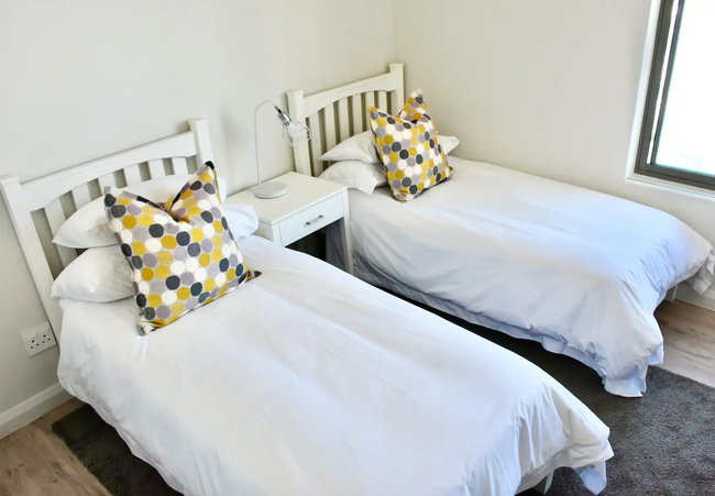 The main bedroom features a king-size bed and an en-suite bathroom equipped with a shower. The second bedroom is fitted with a double bed, while the third offers two single beds. These two rooms share a bathroom that includes both a bath and a shower. The fourth bedroom is a versatile space with a double bed and a single bed, as well as its own en-suite bathroom with a shower. Guests are provided with linen and bath towels for added convenience.