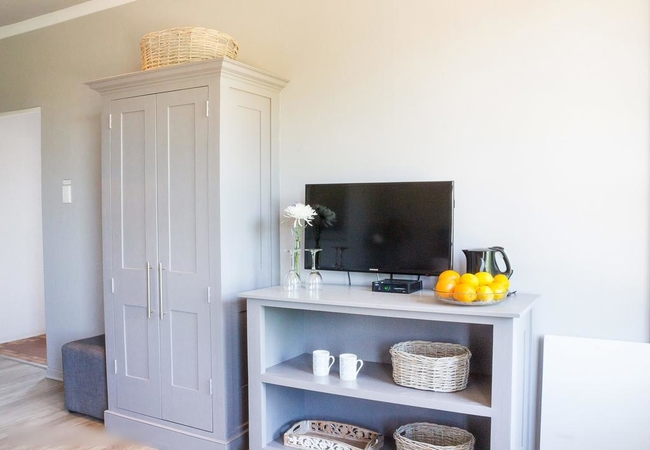 This lovely room is furnished with an extra length queen-size bed. The en-suite bathroom contains a large shower, toilet and hand-basin. The room also has a flat screen TV with DStv / satellite channels.