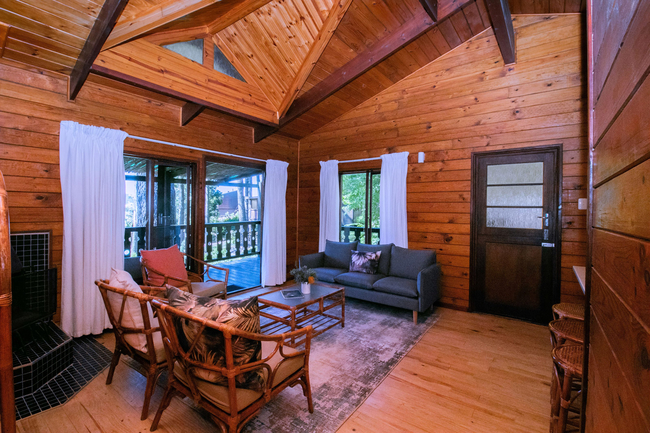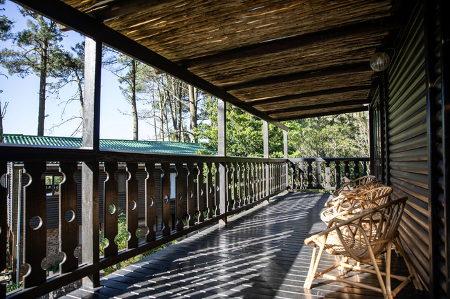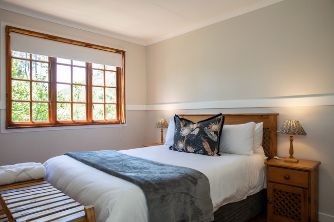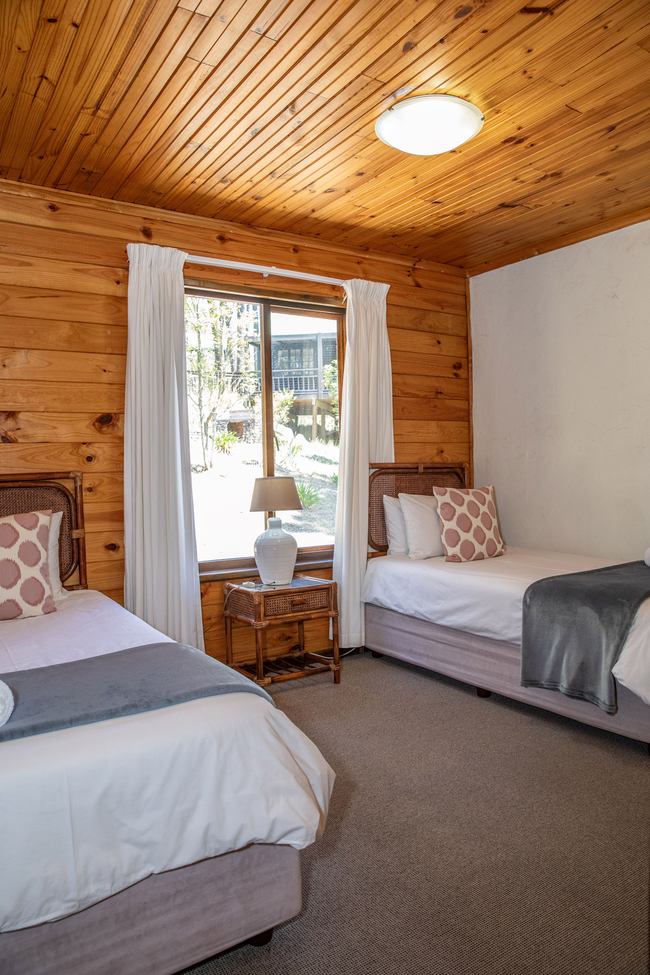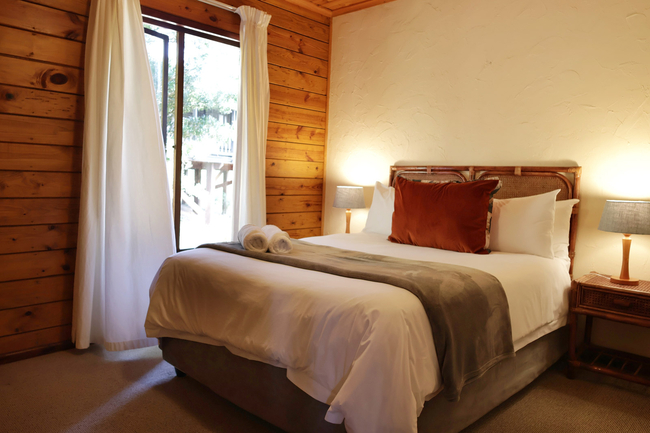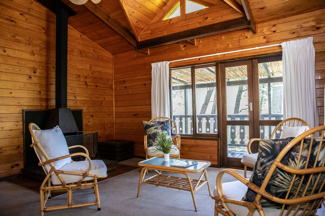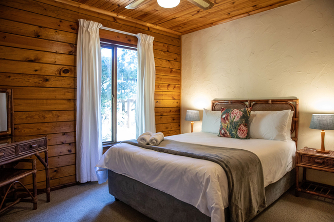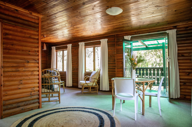 Highlands Lodge Mountain Retreat offers cabins sleeping two, three, four and six people. All cabins are free standing spacious log cabins with private entrances and have wooden decks overlooking the natural scenic surroundings and the Outeniqua Mountains. Eight of the cabins have fireplaces and all chalets have their own braai facilities. 14 of the 16 the log wood cabins are self catering, and these units are serviced daily.