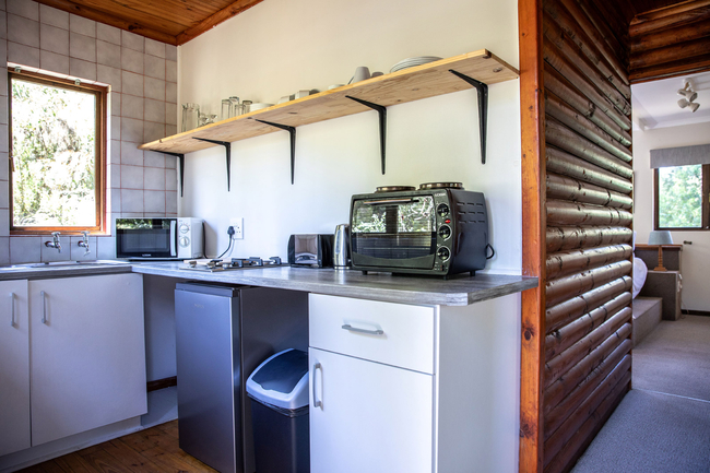 This 2-Sleeper Cabin has one bedroom furnished with a double bed and an en-suite bathroom fitted with a shower, toilet and basin. The open-plan kitchen and living area have a fireplace for the cold winter nights. For warmer evenings, there is an outside braai area. The kitchen is equipped with a 2-plate mini stove, a microwave, a kettle, a fridge, a toaster, cooking utensils, and crockery and cutlery. Please note that our cabins do not have TV or Wi-Fi available.
