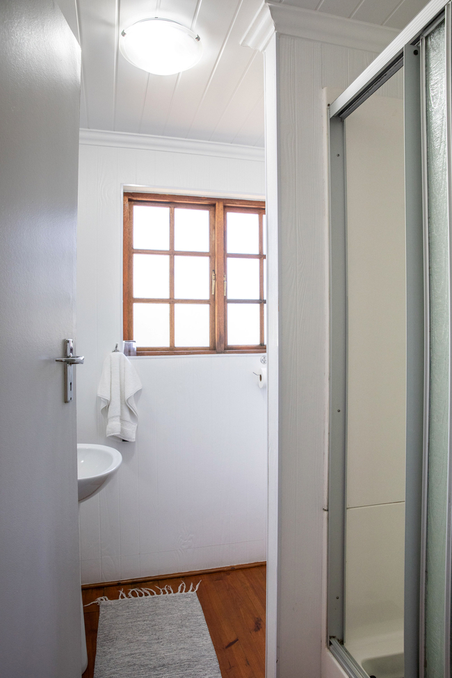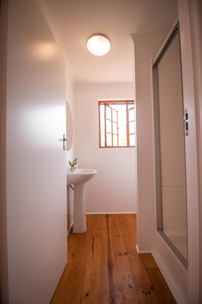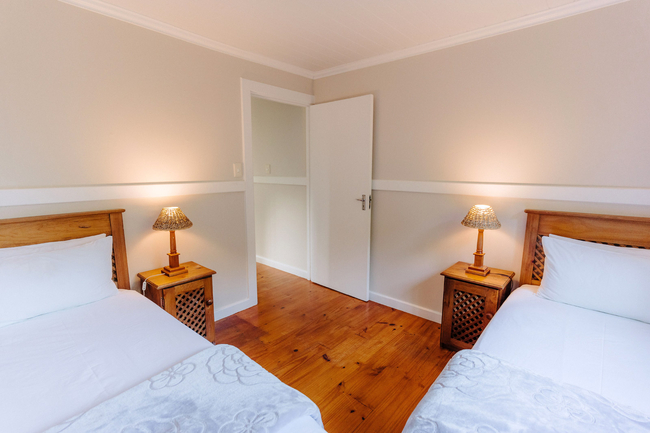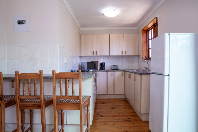 This 5-Sleeper Cabin has two bedrooms. There is a double bed in the one bedroom, and three single beds in the other bedroom. There is a shared bathroom fitted with a shower., toilet and basin The kitchen and living area are open-plan, and the kitchen is equipped with a 2-plate mini stove-and-oven, a microwave, a kettle, a fridge, cooking utensils, and crockery and cutlery. There is an outside braai (barbeque) area. Please note that our cabins do not have TV or Wi-Fi available.