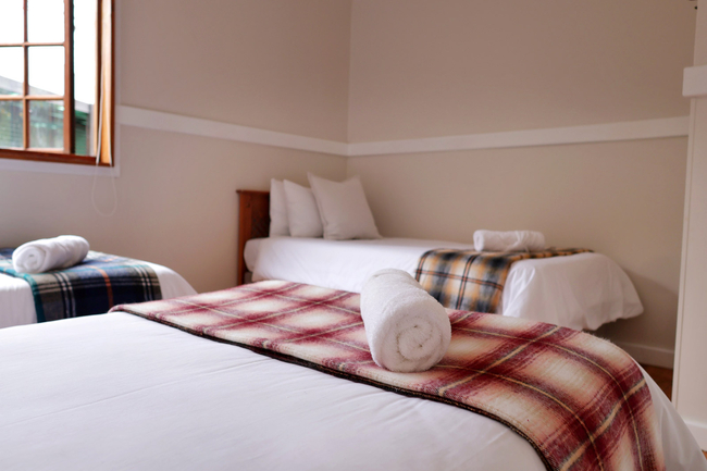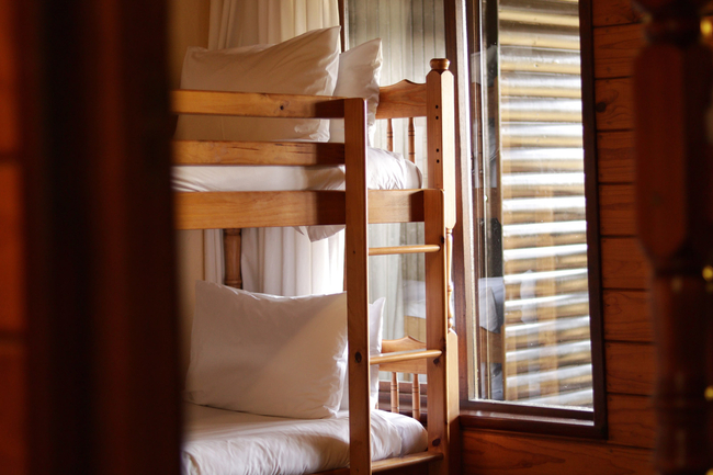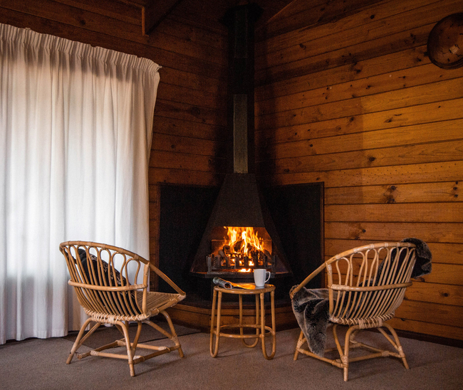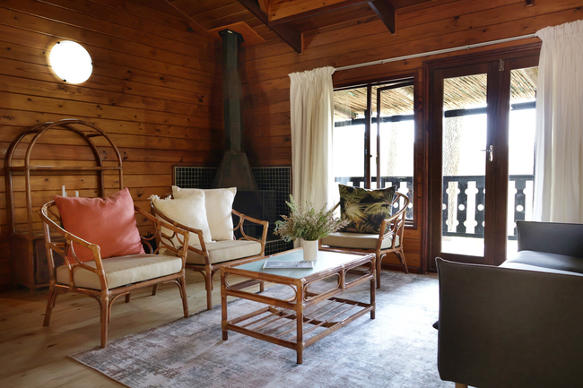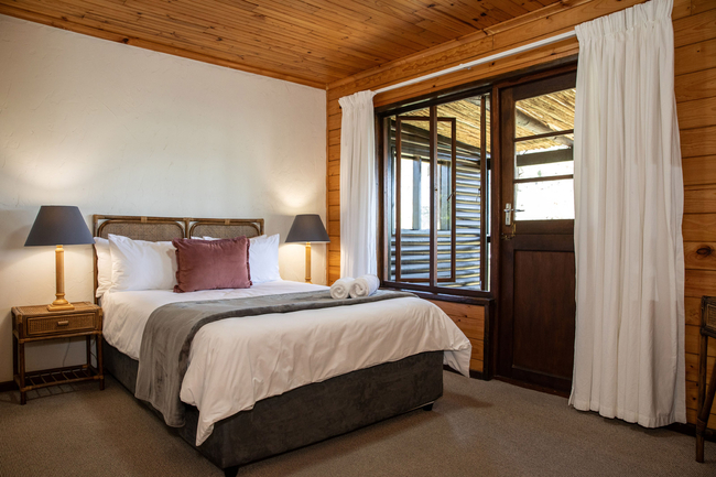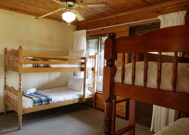 This 6-Sleeper Cabins have two bedrooms. There is a double bed in the one bedroom, and in the second bedroom there are two bunk beds which will sleep 4 children or teenagers. There is a shared bathroom with a shower, toilet and basin. The open-plan kitchen and living area have a fireplace for the cold winter nights. For the warmer evenings, there is an outside braai area. The kitchen is equipped with a 2-plate mini stove-and-oven, a microwave, a kettle, a fridge, cooking utensils, and crockery and cutlery. Please note that our cabins do not have TV or Wi-Fi available.