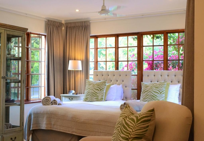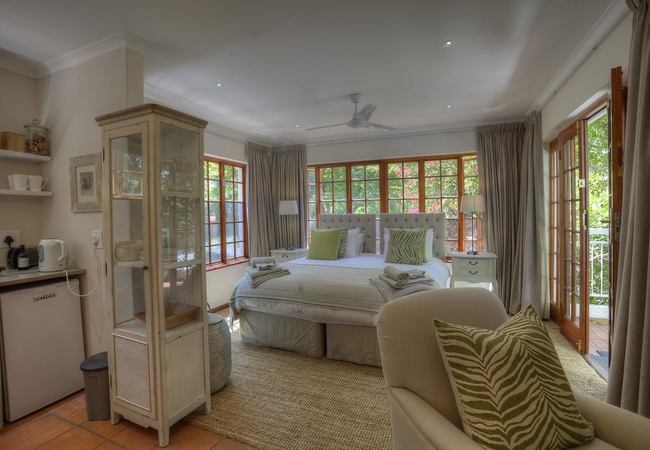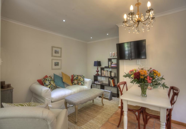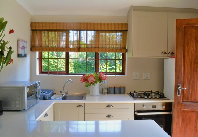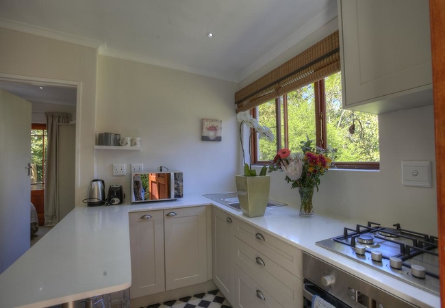 The Garden Cottage can sleep up to two guests. The bedroom includes a Queen-size bed and an en-suite bathroom with a shower, toilet and a basin. The lounge is furnished with couches and a TV with full DStv. There is a kitchen that includes a fridge, a toaster, a kettle, a microwave, an oven and a gas stove with an oven.