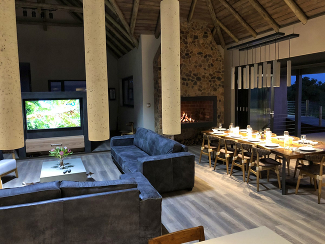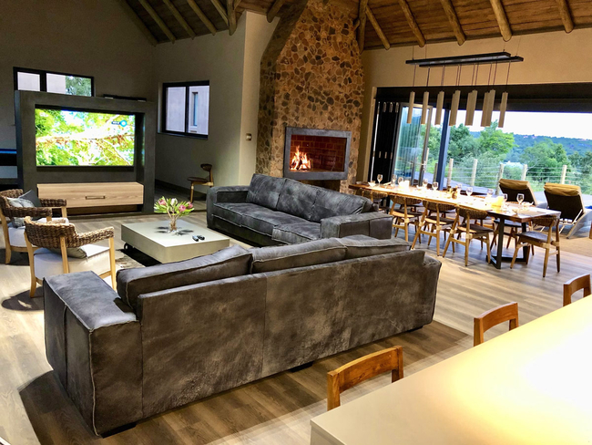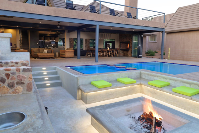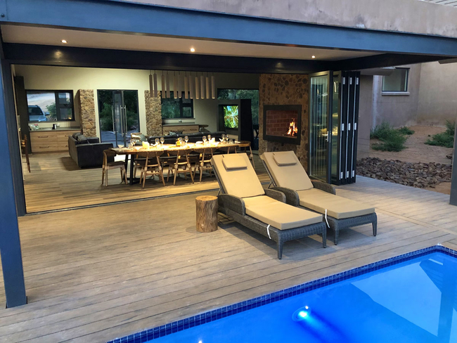 Hillside Lodge is located on the Elements Private Golf Reserve in Bela Bela, Limpopo. This unique golf estate is 130km north of Pretoria. Hillside Lodge has five air conditioned bedrooms which all have en-suite bathrooms. Four of the bedrooms have a King-size bed. Two of these rooms also have two single beds. There is an enclosed loft room with four single beds. The fully equipped kitchen includes a double door fridge / freezer, Nespresso coffee machine and an ice machine. The dining area has seating for ten guests and an indoor braai. The lounge is comfortable and has a flat screen TV with satellite channels. There is also Wi-Fi available. The bar area is perfect for cocktails. The living area folding stacking doors which open up onto a large patio area which has outdoor patio furniture, a sunken fire pit with outdoor seating and braai facilities and a swimming pool with sun loungers. The swimming pool has a seated Jacuzzi area. Guests can enjoy a pool table, air hockey and table tennis. Secure parking is available.