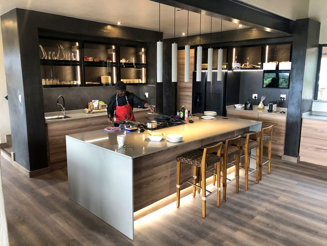The fully equipped kitchen includes a double door fridge / freezer, Nespresso coffee machine and an ice machine. The dining area has seating for ten guests and an indoor braai. The lounge is comfortable and has a flat screen TV with satellite channels. There is also Wi-Fi available. The bar area is perfect for cocktails.