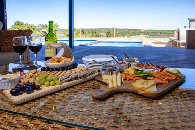 The living area folding stacking doors which open up onto a large patio area which has outdoor patio furniture, a sunken fire pit with outdoor seating and braai facilities and a swimming pool with sun loungers. The swimming pool has a seated Jacuzzi area. Guests can enjoy a pool table, air hockey and table tennis.