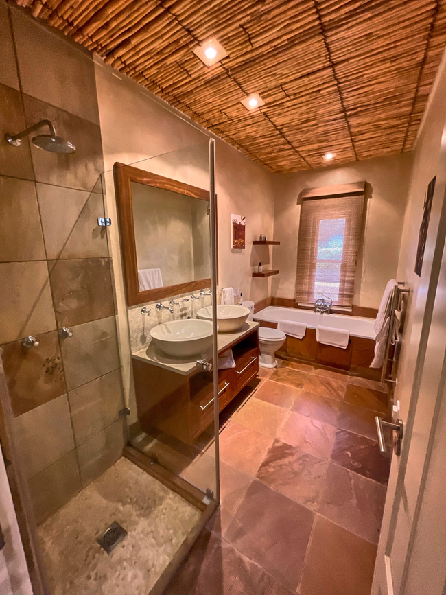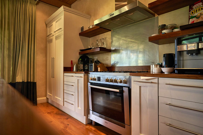 The open-plan lounge and dining area provide ample space to unwind or enjoy a meal, with comfortable seating and the added charm of an indoor fireplace. For entertainment, a television with DStv channels, a DVD player, and complimentary Wi-Fi are available. Underfloor heating adds warmth throughout, and a minibar is also included for guests’ enjoyment.