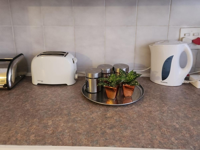 The kitchen is fully equipped to meet all self-catering requirements, and includes a refrigerator, oven, microwave, electric kettle, and a comprehensive range of cookware, crockery, and utensils. Complimentary tea and coffee are also supplied for guests’ enjoyment.