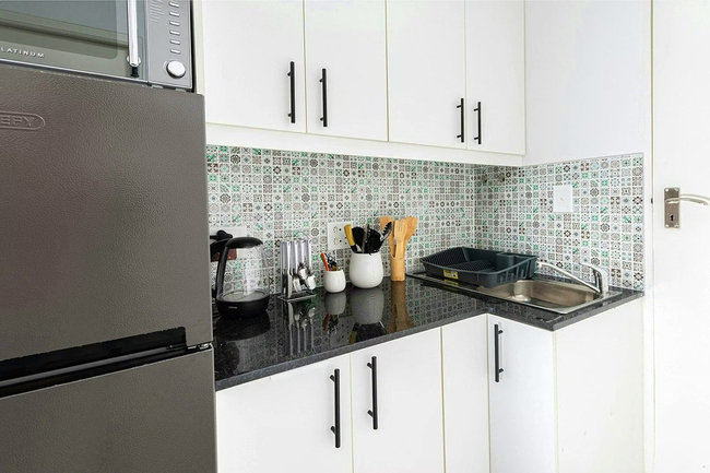 The kitchenette is well-equipped for convenient self-catering, offering a stove, microwave, refrigerator, toaster, air fryer, and coffee and tea-making facilities, along with a selection of kitchen supplies. Additional practical features include a cot for families travelling with young children, as well as converters or voltage adaptors.
