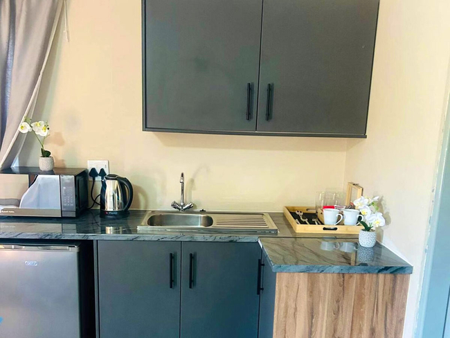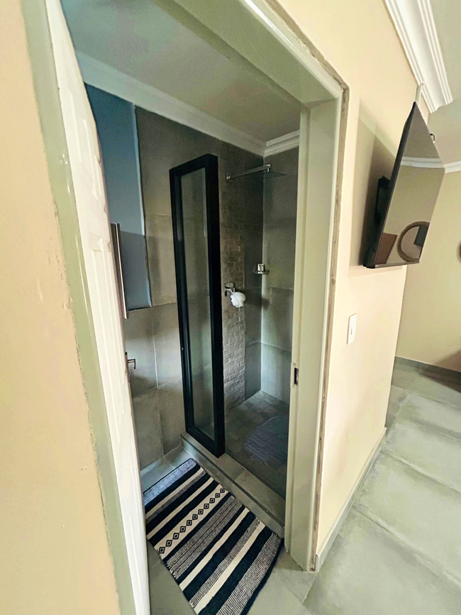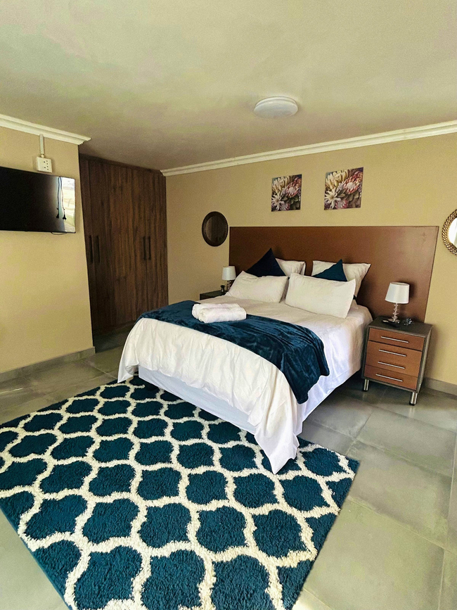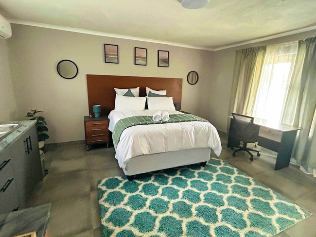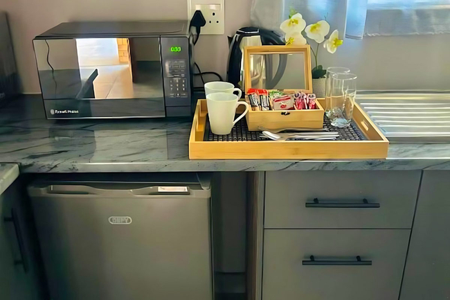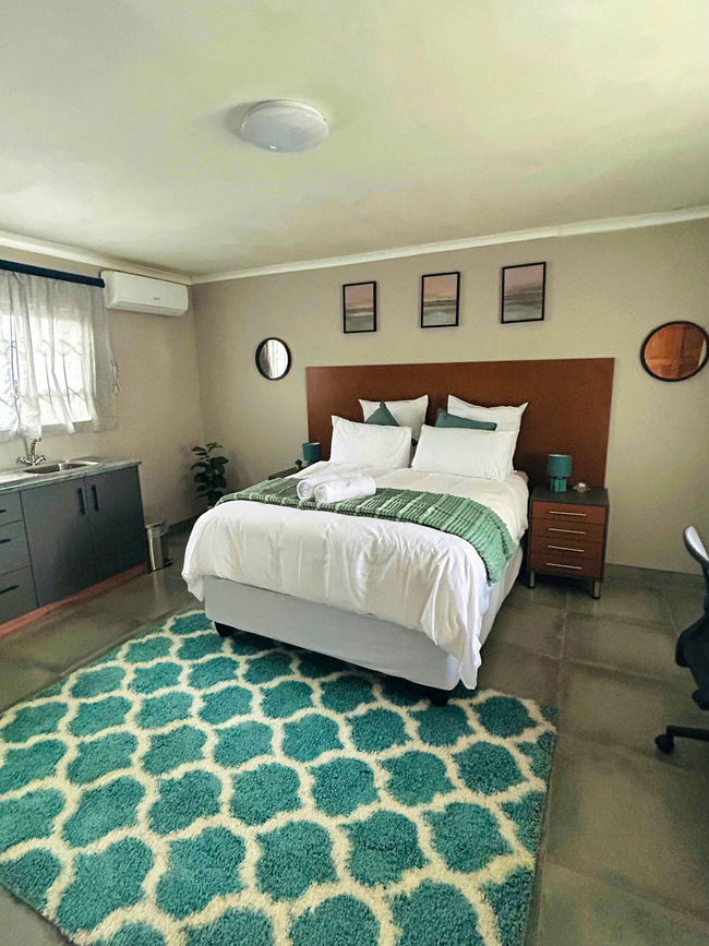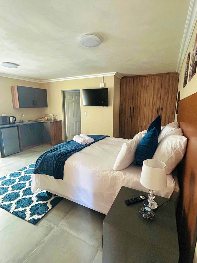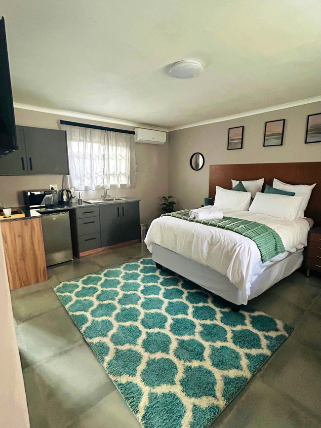This room is furnished with a king-size bed and features an en-suite bathroom with a shower. It offers air-conditioning, a bar fridge, a TV with streaming apps, a desk, and free Wi-Fi, while overlooking the garden and pool. Guests also have access to coffee and tea facilities, a microwave, a hairdryer, an iron with ironing board, and outdoor furniture. This non-smoking unit includes DSTV or satellite TV and benefits from a regular cleaning service for added comfort.