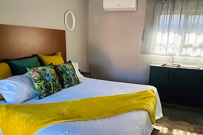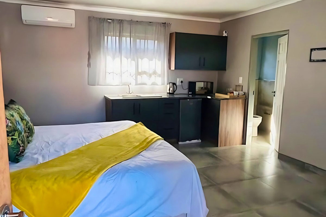 This room is furnished with a double bed and features an en-suite bathroom with a shower. It includes air-conditioning, a bar fridge, a TV with streaming apps, a desk, and free Wi-Fi, with views of the garden and pool. Additional comforts include coffee and tea facilities, a microwave, a hairdryer, an iron with ironing board, and outdoor furniture. This non-smoking unit also provides DSTV or satellite TV and a regular cleaning service for added convenience.