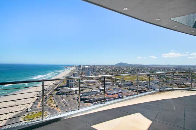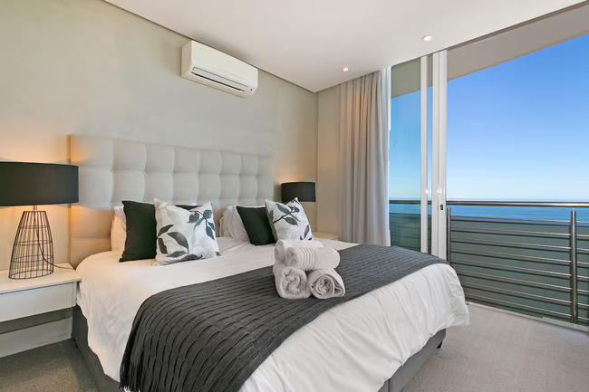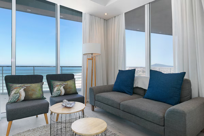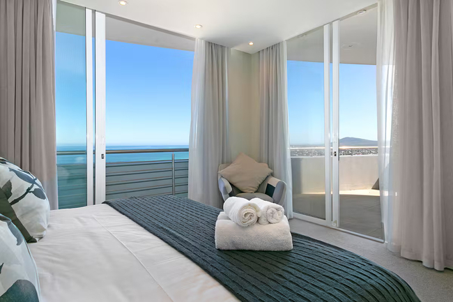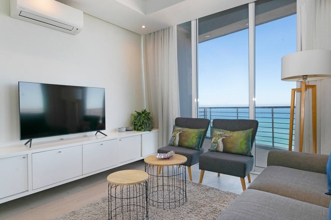 Horizon Bay 1602 Penthouse is a stylish, air-conditioned apartment that features three elegantly decorated bedrooms, offering comfortable accommodation for up to six guests. The main bedroom is furnished with a king-size bed and includes an en-suite bathroom with a bath, double basin, and toilet. The second bedroom has a queen-size bed and an en-suite bathroom with a shower, basin, and toilet. The third bedroom contains two single beds and makes use of a separate bathroom with a shower, basin, and toilet. Guests are provided with fresh linen and soft towels for their stay. The kitchen is well appointed with modern appliances including a fridge-freezer, stove, oven, microwave, cutlery, crockery, and a quality coffee machine. A centrally placed breakfast island with stools creates a welcoming spot for casual dining. A separate scullery houses the washing machine for added convenience. The lounge offers a comfortable seating area with a television, and large windows frame uninterrupted sea views, which extend further into the adjoining dining space. Sliding doors from the lounge open onto a private balcony with panoramic ocean views, an ideal setting to watch the sun dip below the horizon in the evenings.