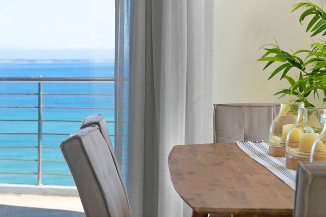 Sliding doors from the lounge open onto a private balcony with panoramic ocean views, an ideal setting to watch the sun dip below the horizon in the evenings.