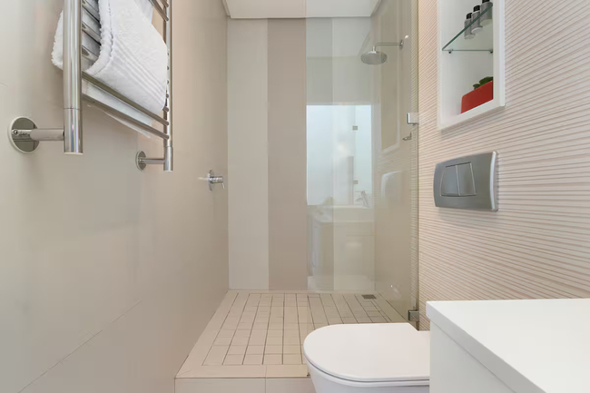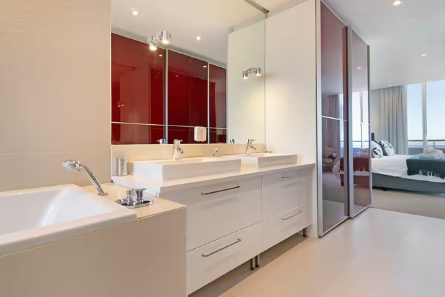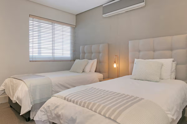 The main bedroom is furnished with a king-size bed and includes an en-suite bathroom with a bath, double basin, and toilet. The second bedroom has a queen-size bed and an en-suite bathroom with a shower, basin, and toilet. The third bedroom contains two single beds and makes use of a separate bathroom with a shower, basin, and toilet. Guests are provided with fresh linen and soft towels for their stay.