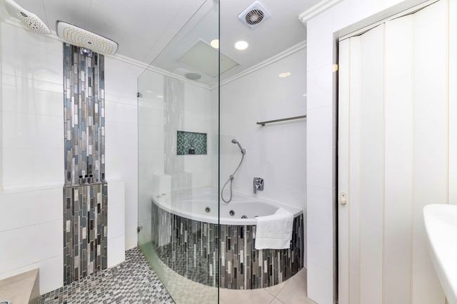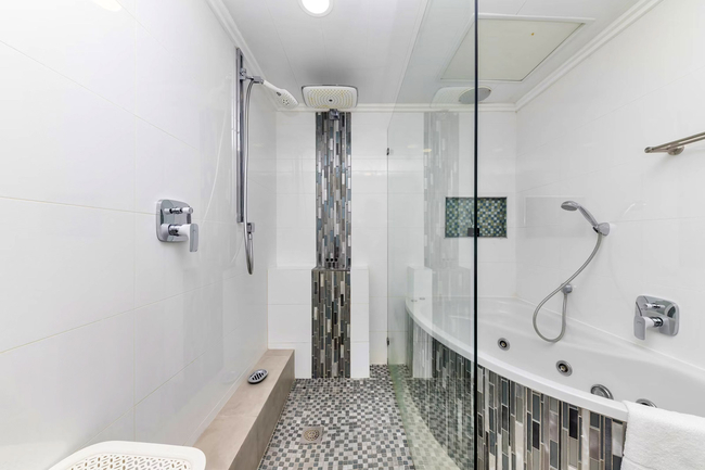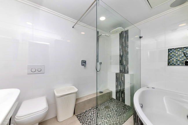 The main bedroom is furnished with a king-size bed and features a private en-suite bathroom fitted with a shower, basin, and toilet. The second bedroom has a double bed, while the third is arranged with two single beds. These two rooms share a guest bathroom complete with a corner bath, walk-in shower, basin, and toilet. Fresh linen and towels are supplied to ensure a comfortable stay.
