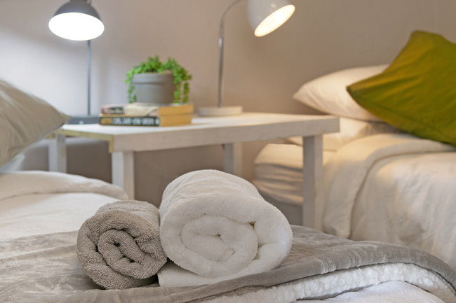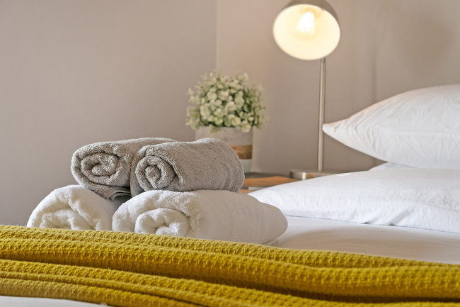 The main bedroom features a queen-size bed and an en-suite bathroom with a shower, basin, and toilet. The second bedroom has two single beds and makes use of a separate guest bathroom, also fitted with a shower, basin, and toilet. High-quality linen and fresh towels are provided to enhance the experience.