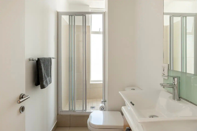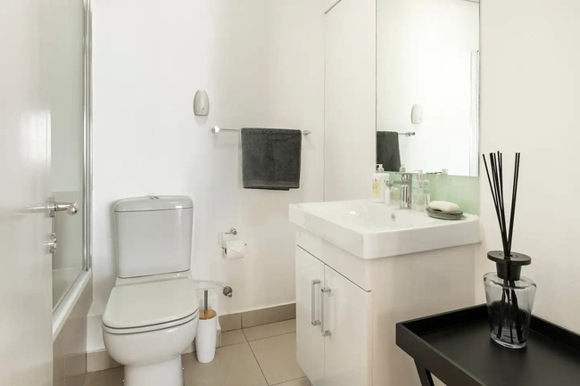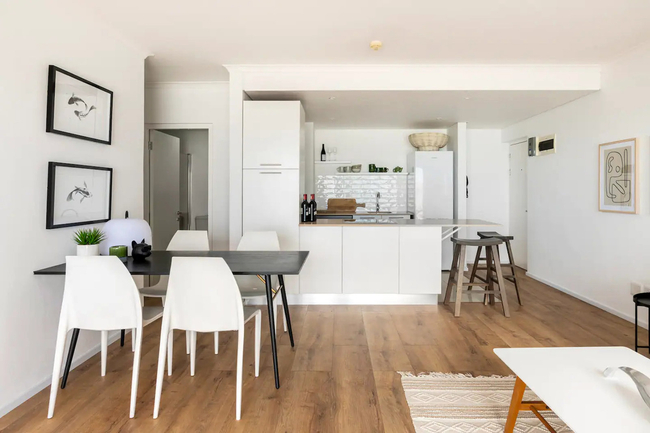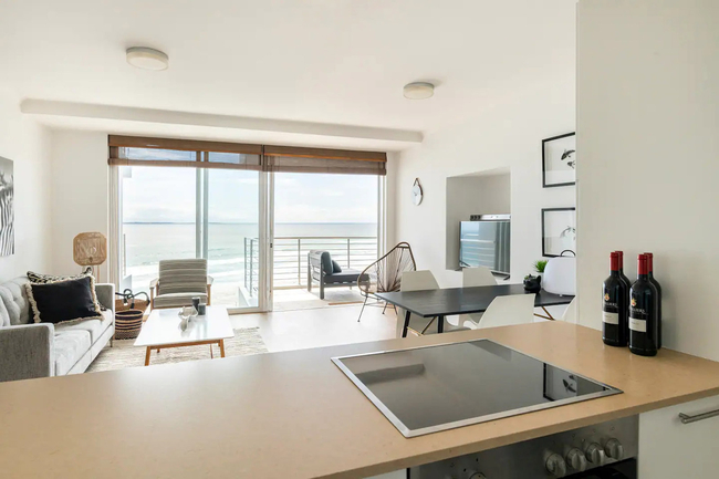 Designed to accommodate up to four guests, the apartment features two tastefully appointed bedrooms, two bathrooms, and a spacious open-plan kitchen that flows seamlessly into the living area. The main bedroom, furnished with a queen-size bed, opens onto the balcony and allows guests to wake up to sweeping sea views. It includes an en-suite bathroom with a shower-over-bath, basin, and toilet. The second bedroom, styled with two single beds, has access to a separate bathroom fitted with a shower, basin, and toilet. Quality linen and towels are thoughtfully provided for a relaxed and convenient stay. The contemporary kitchen is equipped with everything needed for effortless self-catering, including a fridge-freezer, oven, stove, microwave, small gas stove, and tea and coffee-making facilities. A central breakfast island with bar stools creates a welcoming space for casual dining. The kitchen extends into a comfortable lounge, complete with soft seating and a television, where guests can enjoy free Wi-Fi throughout their stay. Even during power interruptions, an inverter maintains entertainment and internet access, with an additional plug point offering extra convenience during load shedding. The balcony is the perfect vantage point from which to take in uninterrupted views across the ocean, with Robben Island on the horizon and sunsets that provide a spectacular close to the day. Guests also benefit from secure parking within the complex as well as access to a communal swimming pool.
