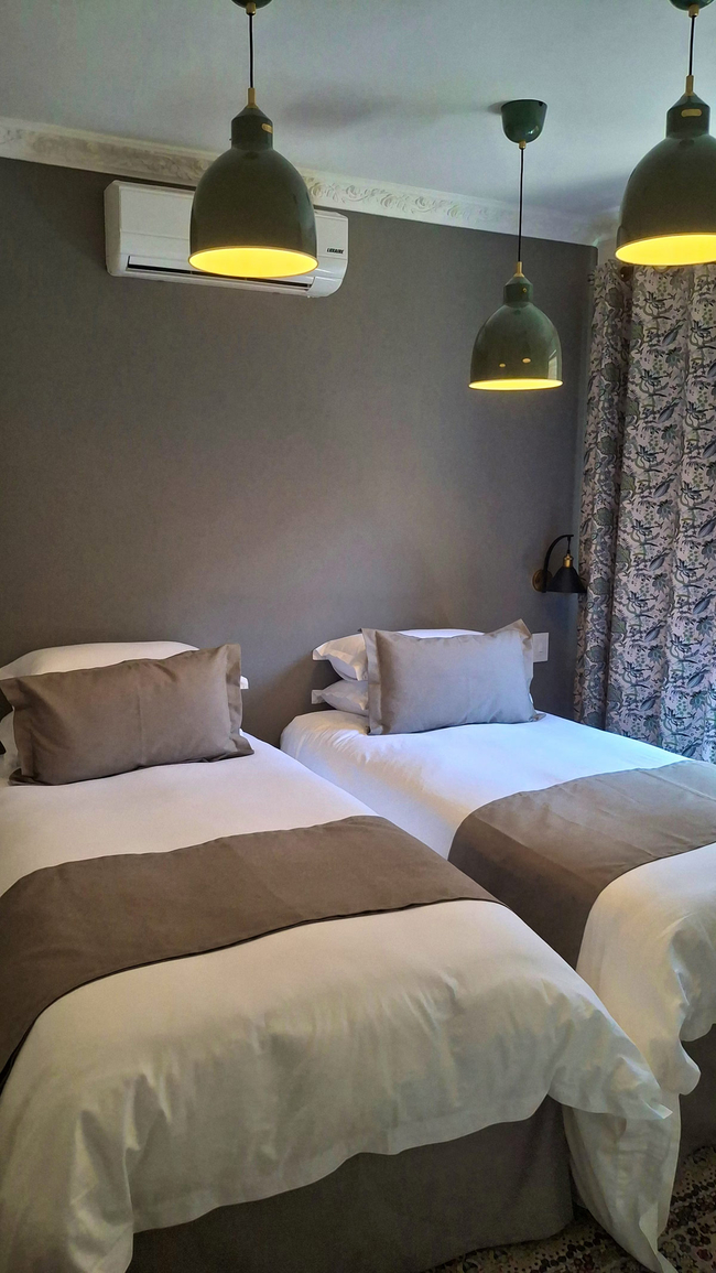 The air-conditioned property can host up to 11 guests, comprising two bedrooms in the main house and three additional bedrooms in a separate building, along with six bathrooms in total. In the main house, each bedroom is furnished with two single beds that can be configured as king-size beds, while two of the outside bedrooms each have two single beds, and the final bedroom features one single bed and two three-quarter beds.
