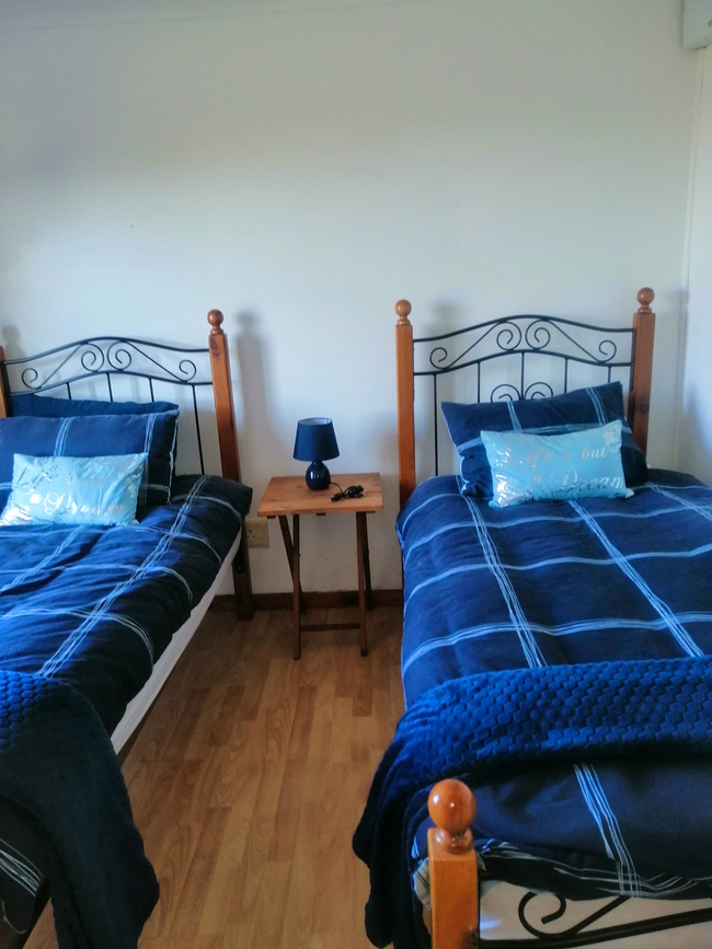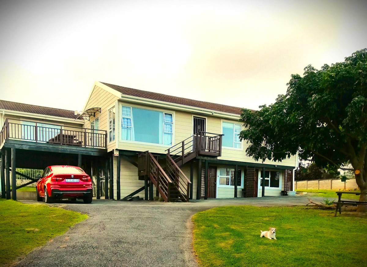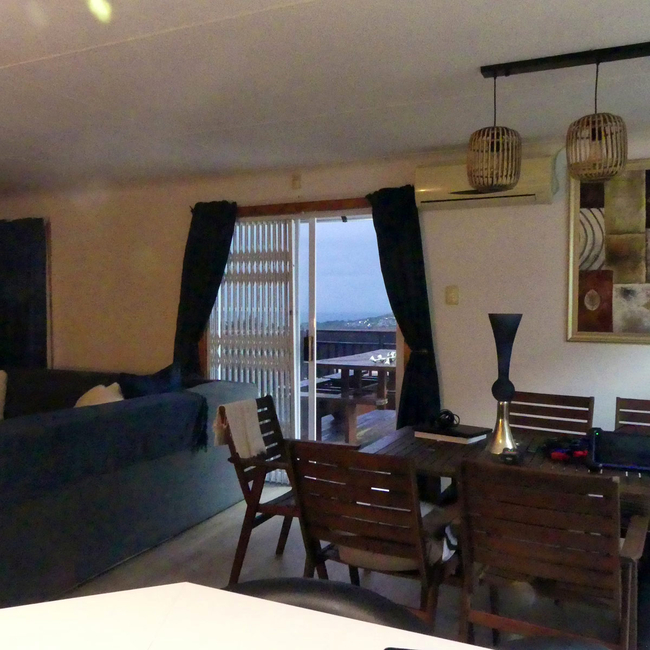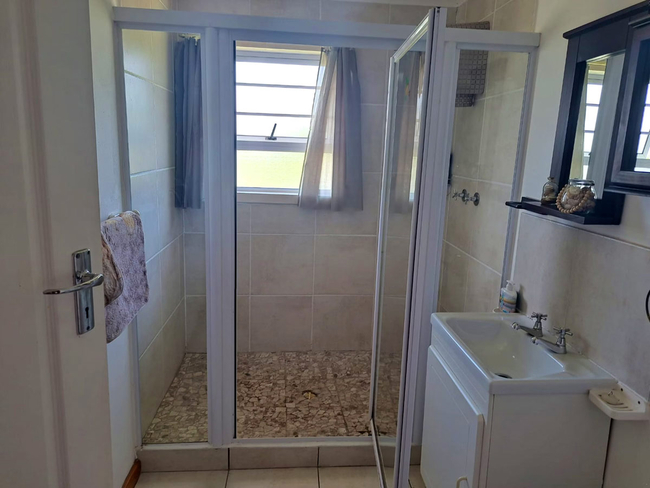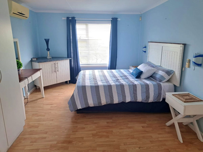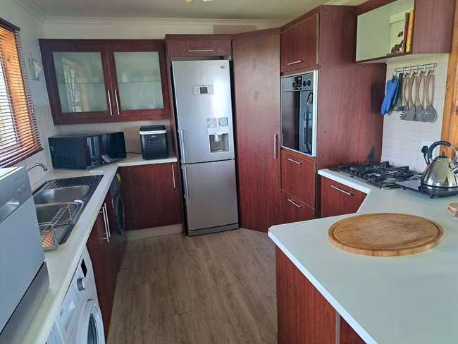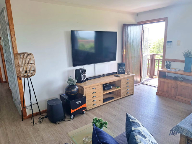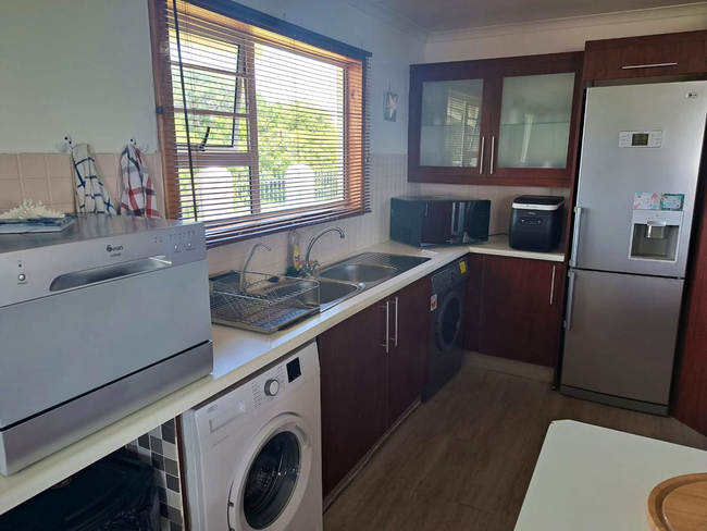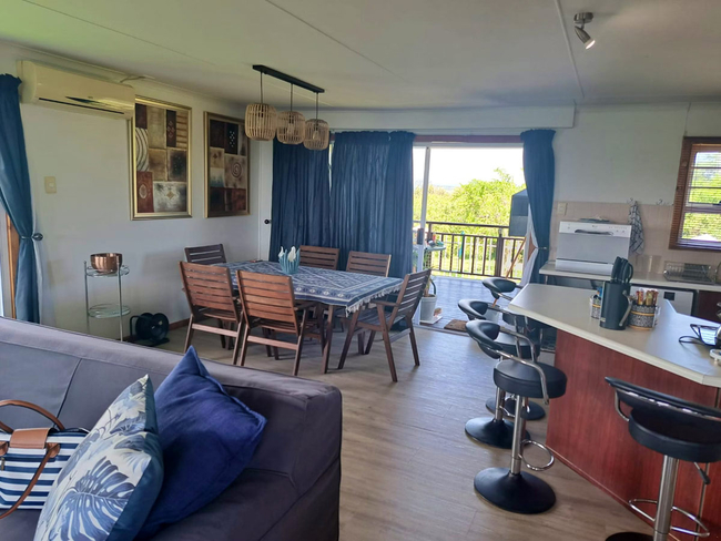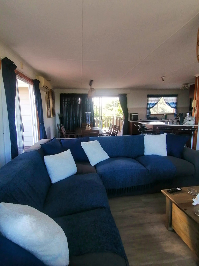 The main house presents a generous accommodation option for families or groups, featuring two bedrooms and two bathrooms, complemented by a spacious open-plan living area. A fully equipped kitchen ensures ease for self-catering, while the inviting lounge and informal bar area offer a warm and welcoming setting for socialising. Outdoors, guests can enjoy a dedicated braai space, adding to the relaxed coastal lifestyle.