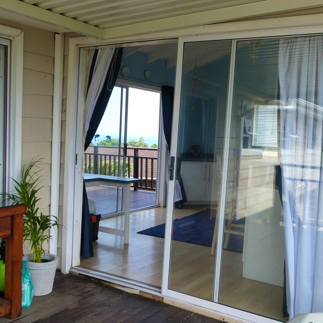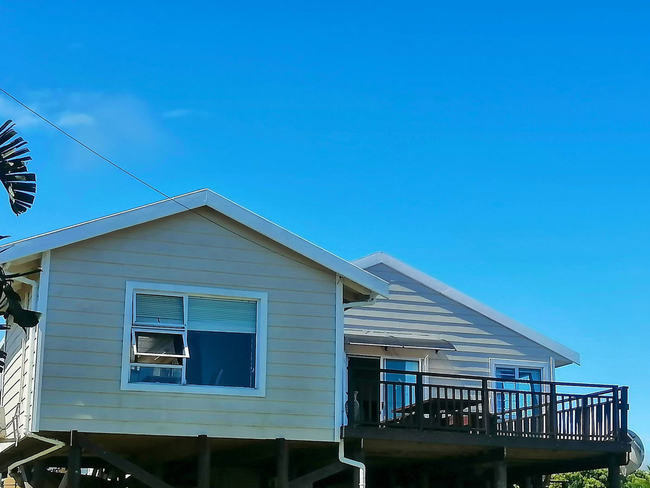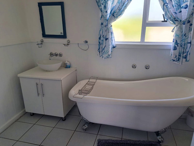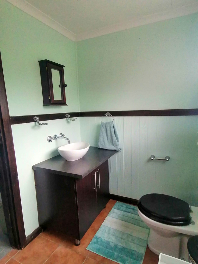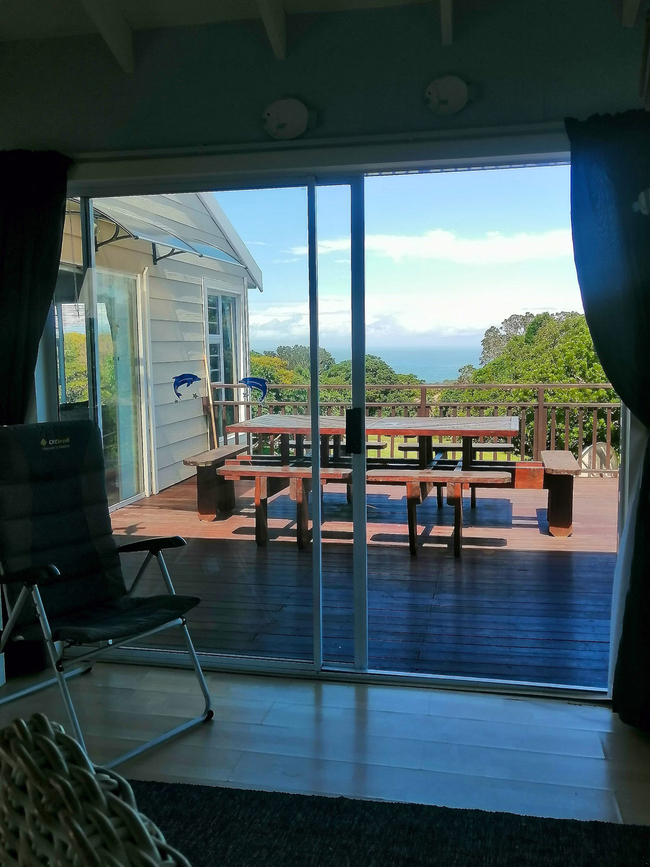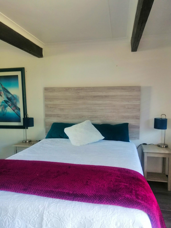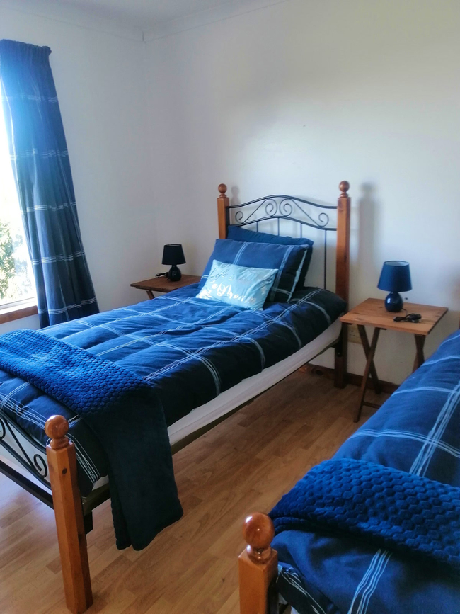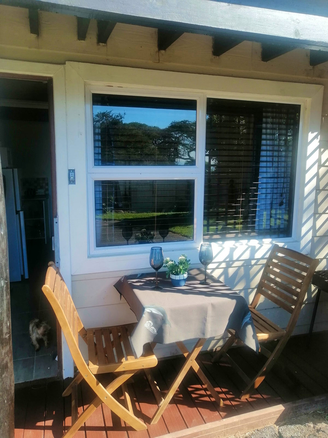 Main House offers a spacious and comfortable stay, ideal for families or small groups. It features two bedrooms and two bathrooms, with the first bedroom furnished with a queen-size bed and the second offering two single beds. The open-plan living area includes a fully equipped kitchen with a stove, oven, microwave, washing machine, crockery, and cutlery. The dining area features a 6-seater table, while the lounge offers a cozy L-shaped couch, a TV, and a double sleeper couch for additional guests. Sliding doors lead out to a deck with outdoor seating, perfect for enjoying the fresh air and relaxed surroundings. The unit includes 2 bedrooms and 2 bathrooms, providing both comfort and functionality for longer stays.