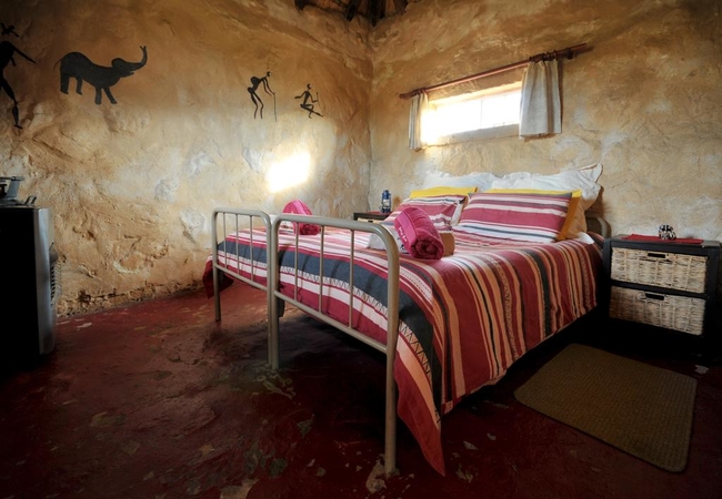 Outside entrance with a beautifully decorated carved rhino door. The large ceiling-to-floor windows gives a view into a private African rock-art garden. It has a king-size double bed as well as a sleeper couch for a child. En-suite toilet and shower.