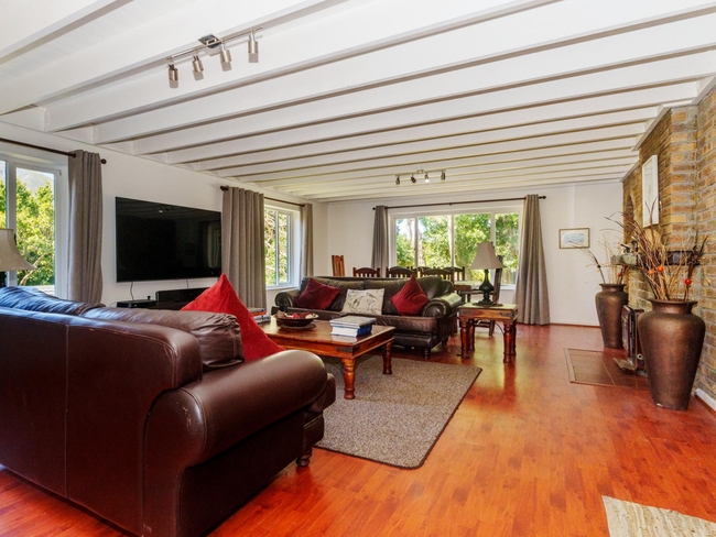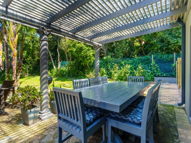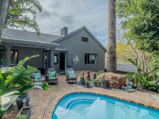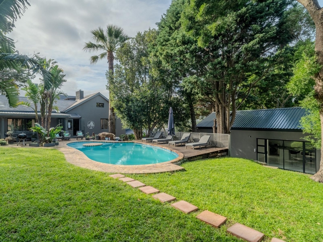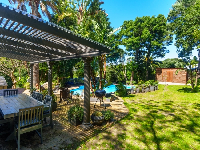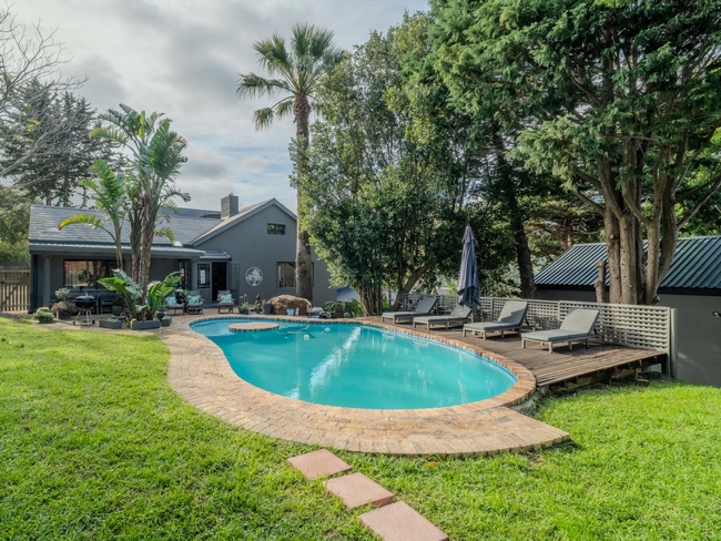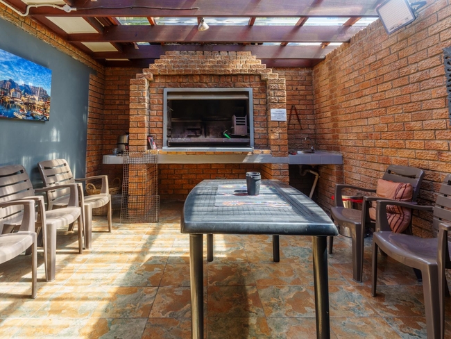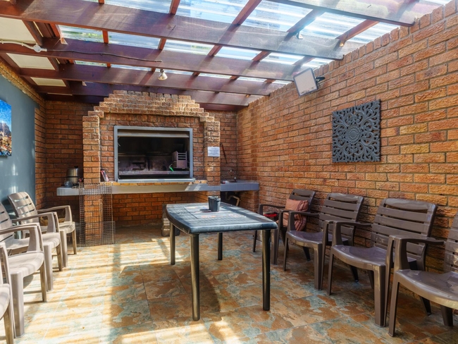 The home has a large garden, swimming pool, braai facilities, and a pool deck with outdoor furniture. Secure parking is available.