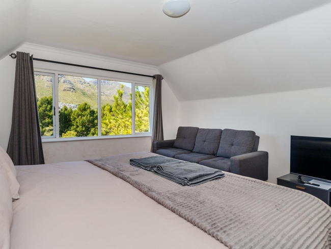 This lower level room is furnished with a king-size bed, a three-quarter sleeper couch, a work desk, and a Smart Android TV. The room has an en-suite bathroom fitted with a shower, bath, toilet and basin. Free fibre Wi-Fi is available. This room has a view of the mountain.