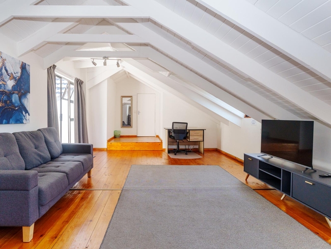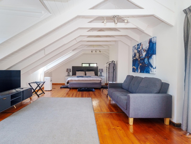 This spacious loft room has wooden floors, and is furnished with a king-size bed, a three-quarter sleeper couch, a work desk, and a Smart Android TV. The room has an en-suite bathroom fitted with a shower, toilet and basin. The loft also has a private balcony with outdoor furniture.