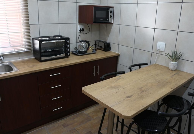 Room 8 is a Family Unit furnished with a Standard Queen-size bed in main bedroom plus two three-quarter beds in open area. The en-suite bathroom is equipped with a shower, hand basin and toilet. Other facilities in the rooms include a fridge, tea and coffee facilities, TV with DStv, high quality bedding and air-conditioning and Free WiFi connection. Kitchen equipped with fridge/freezer, microwave, small oven, cutlery and crockery. Outside entrance.