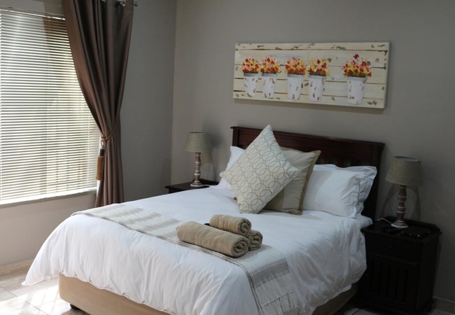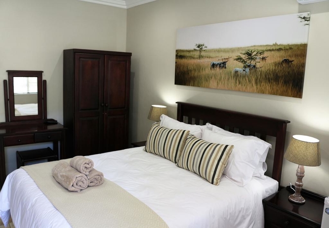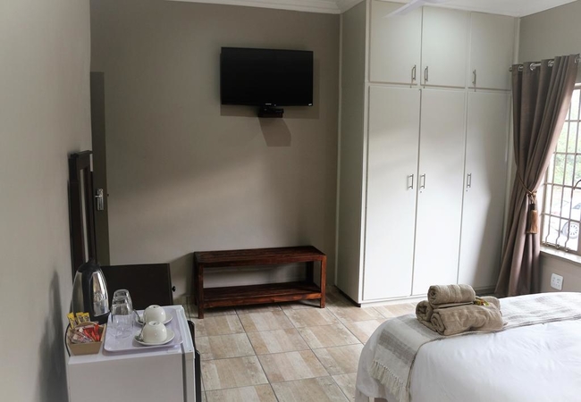 Room 5 is a queen room of 18 sqm furnished with a Queen-size bed. The en-suite bathroom is equipped with a shower, hand basin and toilet. Other facilities in the rooms include a fridge, tea and coffee facilities, TV with DStv, high quality bedding and air-conditioning and Free WiFi connection.