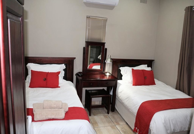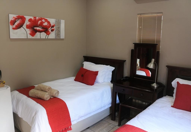 Room 4 is a budget twin room of 18 sqm furnished with two three-quarter beds. The en-suite bathroom is equipped with a shower, hand basin and toilet. Other facilities in the rooms include a fridge, tea and coffee facilities, TV with DStv, high quality bedding and air-conditioning and Free WiFi connection.