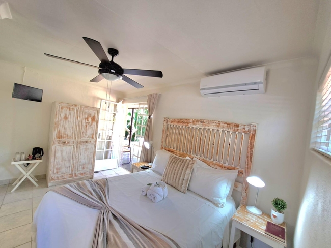 The Traditional Double Room with en-suite combines classic comfort with thoughtful modern touches for a relaxing stay. This non-smoking room features a double bed and a private bathroom fitted with a shower and complimentary amenities. Overlooking the pool, the room is equipped with air conditioning and a ceiling fan to ensure year-round comfort. Guests can enjoy DStv and a TV with streaming services, complimentary Wi-Fi, and convenient coffee- and tea-making facilities. Towels are provided, and guests also have access to a communal boma area with a fully equipped kitchen — ideal for shared meals and relaxed evenings.