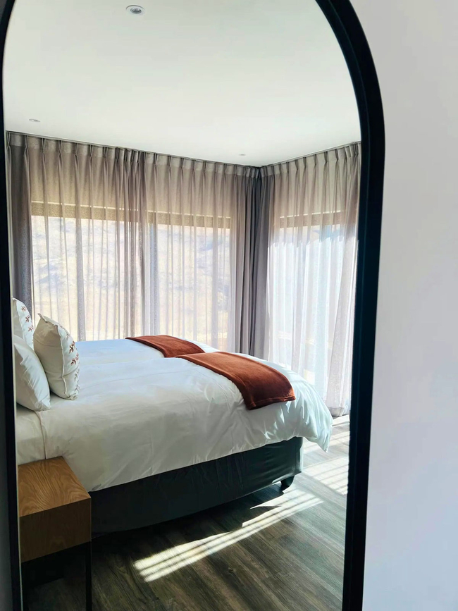 The outdoor dining area on the private patio offers panoramic views of the stunning landscape. The expansive living spaces include a chic open-plan lounge with a flat-screen TV and an indoor barbeque, which opens onto a balcony, perfect for savoring the crisp, high-altitude air.