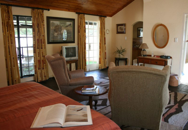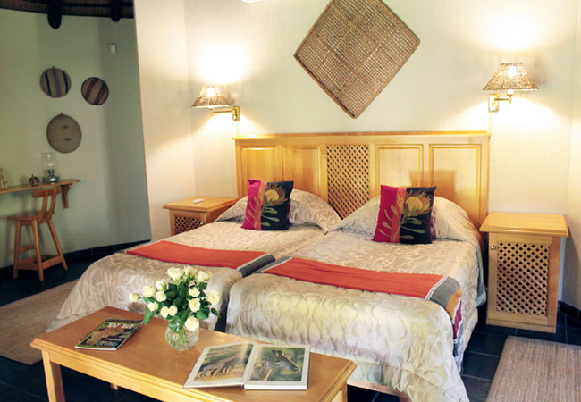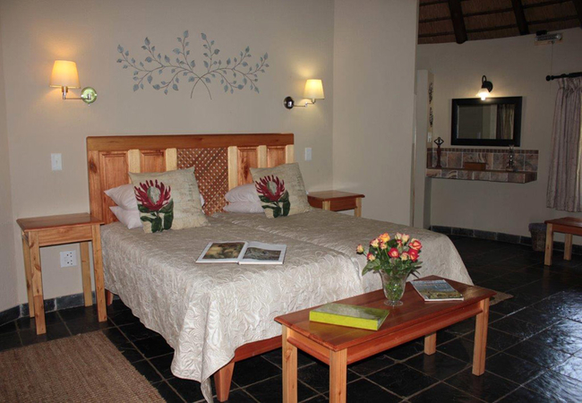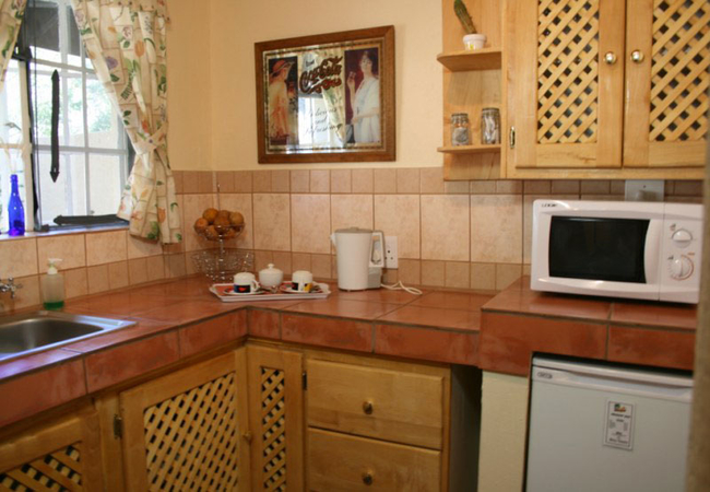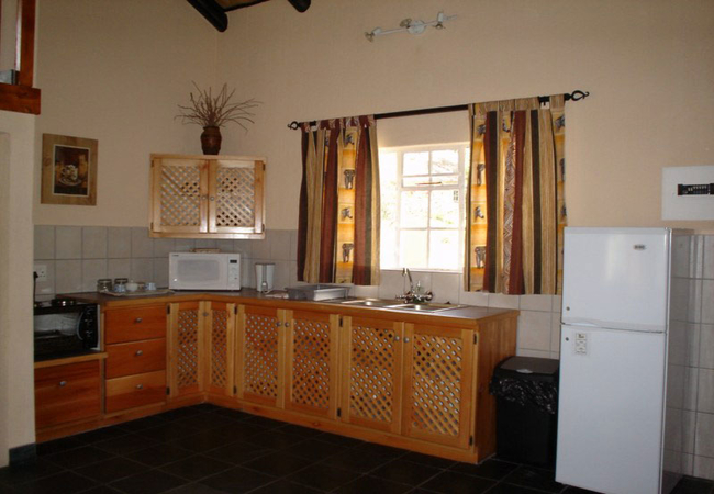 Each Rondavel, has two three-quarter size beds, shower en-suite, semi-kitchenette equipped with a bar fridge, microwave, kettle, toaster, cutlery and crockery and private veranda overlooking the garden. Each has its own braai (BBQ) area.