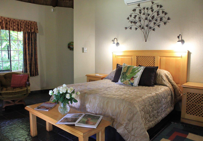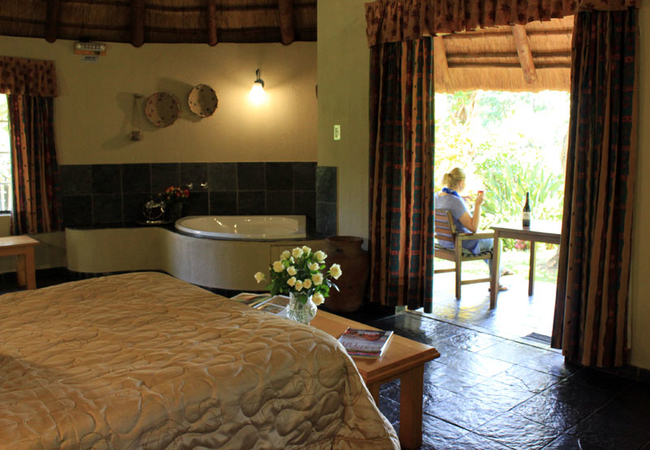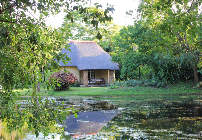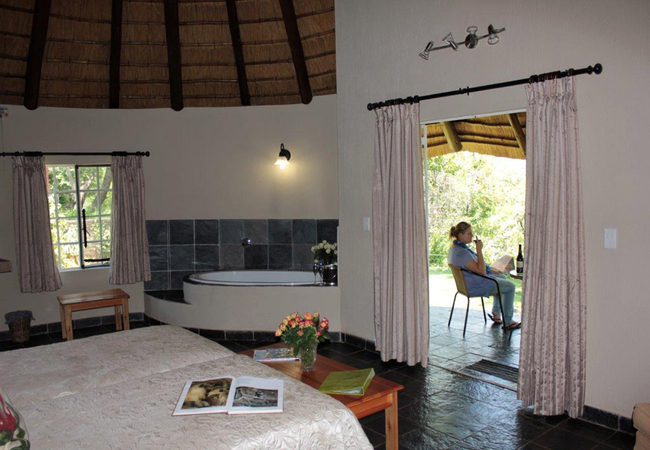The luxury rondavel has a queen-size bed, private spa-bath, shower en suite, air-conditioner, kitchenette equipped with a bar fridge, microwave, kettle, cutlery, and crockery. A private Braai (barbecue) facility ideal for the evenings you want to spend alone. Set in a tranquil sub-tropical garden overlooking the dam.