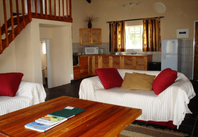 Our cottage is ideal to accommodate four people. Main bedroom has a queen size bed and bathroom en-suite. Bedroom upstairs has two single beds and shower en-suite. Open plan lounge with fireplace and fully equipped kitchen. Private veranda and braai facilities