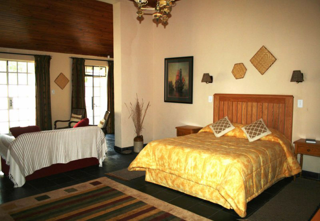 The sunbird room is adjoined to the Main House. The open plan room has one queen size bed with bath en suite, air-conditioner, lounge area with TV (SABC & E-TV - please bring your own smart card should you wish to view the entire spectrum of DStv) and a kitchenette with a bar fridge, microwave, kettle, toaster, cutlery & crockery. Separate small room with bunk beds, toilet & basin. The room has two separate entrances; one entrance is close to reception and the other off a private court yard with braai facility.