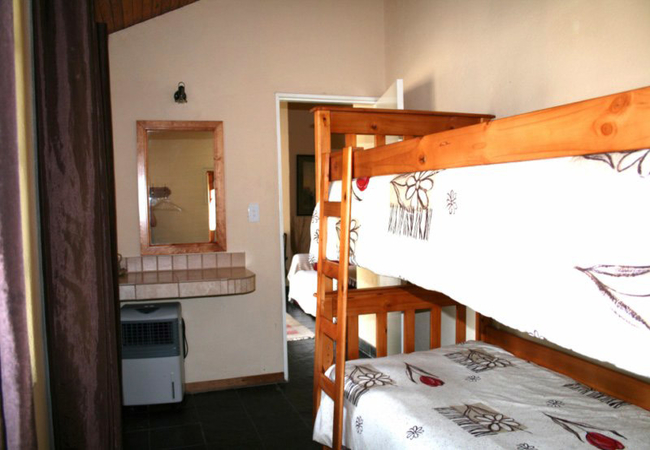Adjoined to Main House with open plan room, queen size bed, bath en-suite, air-Conditioner, lounge with TV(Sabc) semi-kitchenette. Separate small room with bunk beds, toilet and basin. 2 Entrances, 1 close to reception and other to private courtyard with BBQ